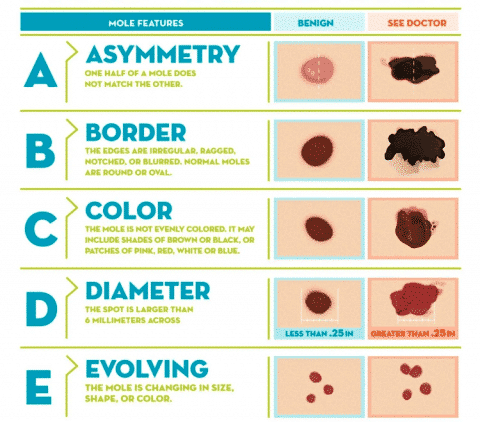 Qui parliamo di prevenzione secondaria, ovvero di diagnosi precoce. Partiamo da due informazioni chiave: la prima è quella delle lettere ABCDE dove A sta per asimmetria; ovvero una lesione che non è simmetrica; B sta per bordi irregolari, a cartina geografica; C sta per colore che cambia, D sta per dimensioni superiori a 6 millimetri; E sta per evoluzione nel giro di poco tempo, settimane o mesi.