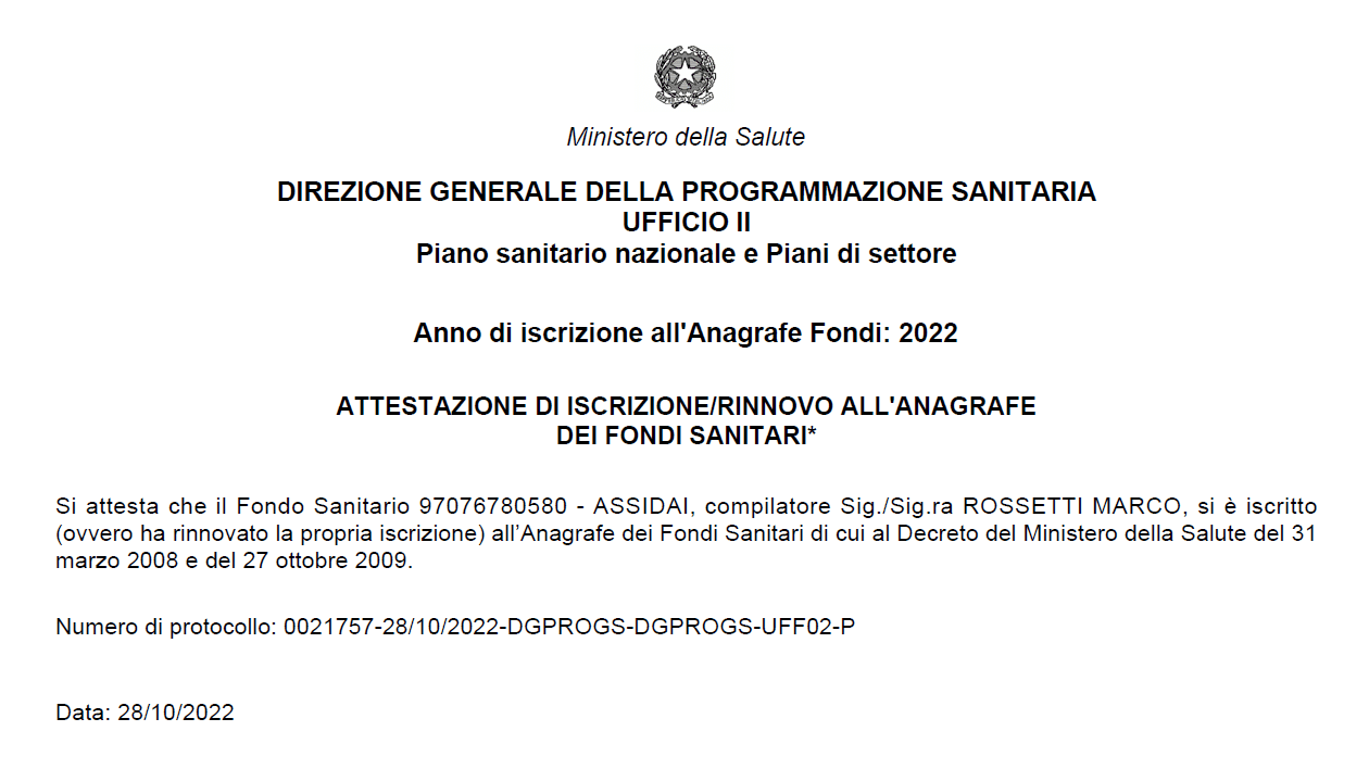 Assidai ha ottenuto dal Ministero della Salute, con numero di protocollo 0021757-28/10/2022-DGPROGS-DGPROGS-UFF02-P il rinnovo dell’iscrizione all’Anagrafe dei Fondi Sanitari per l’anno 2022 ai sensi del Decreto del Ministero della Salute del 31 marzo 2008 e del 27 ottobre 2009.