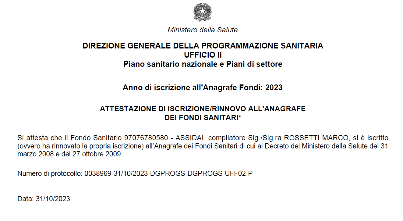 Assidai ha ottenuto dal Ministero della Salute, con numero di protocollo 0038969-31/10/2023-DGPROGS-DGPROGS-UFF02-P il rinnovo dell’iscrizione all’Anagrafe dei Fondi Sanitari per l’anno 2023 ai sensi del Decreto del Ministero della Salute del 31 marzo 2008 e del 27 ottobre 2009.