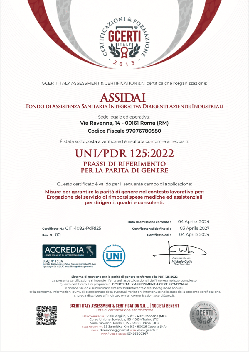 Assidai è un Fondo Sanitario Integrativo certificato UNI PdR 125:2022 Prassi di riferimento per la parità di genere per il seguente campo di applicazione “Misure per garantire la parità di genere nel contesto lavorativo per: Erogazione del servizio di rimborsi spese mediche ed assistenziali per dirigenti, quadri e consulenti”. La certificazione è stata rilasciata da GCERTI.