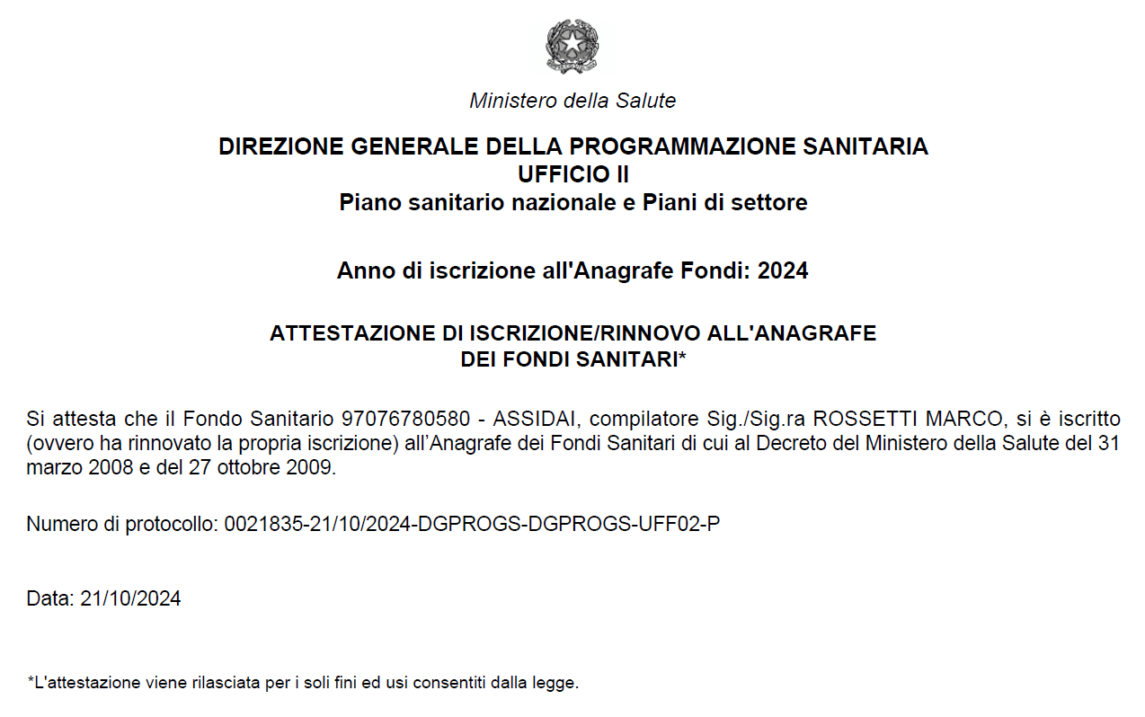 Assidai ha ottenuto dal Ministero della Salute, con numero di protocollo 0021835-21/10/2024-DGPROGS-DGPROGS-UFF02-P il rinnovo dell’iscrizione all’Anagrafe dei Fondi Sanitari per l’anno 2024 ai sensi del Decreto del Ministero della Salute del 31 marzo 2008 e del 27 ottobre 2009.
